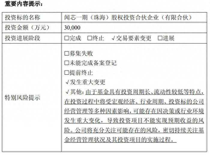公告提示,基金投资具有周期长、流动性低的特点,受宏观经济、行业周期、投资标的经营管理等多重因素影响,可能存在因决策或行业环境重大变化导致投资项目无法实现预期收益的风险。闻泰科技将持续关注基金经营管理状况及投资项目实施过程,积极应对潜在风险。