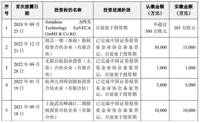 截至目前,闻泰科技在私募基金合作投资领域已有多项布局:除闻芯一期外,还参与投资了 Amadeus APEX Technology EuVECA GmbH & Co KG、无限启航创业投资(太原)合伙企业(有限合伙)、杭州九州舜创股权投资合伙企业(有限合伙)等多个基金项目,认缴总规模涵盖人民币及欧元币种,各项目均处于投资期,已完成相应备案登记。